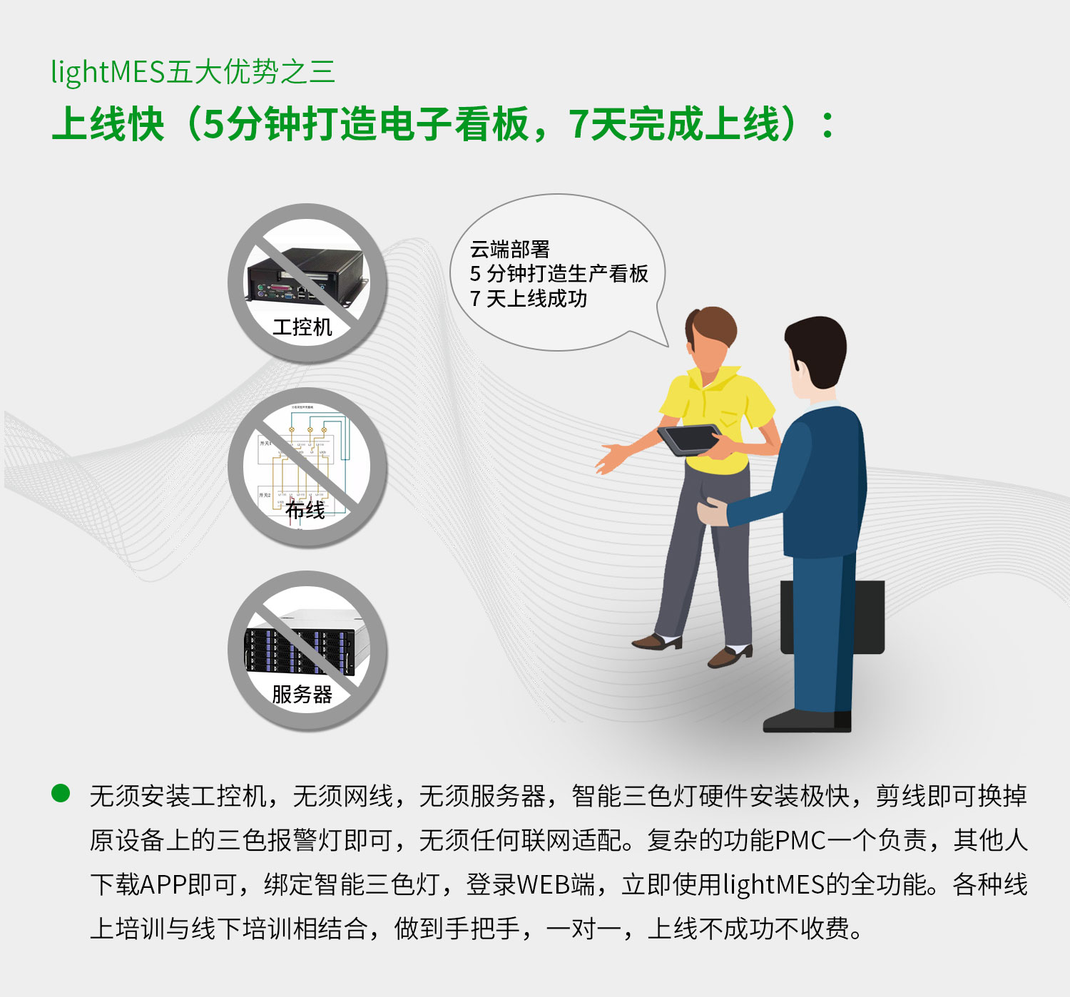 機床管家云MES管理系統(tǒng)優(yōu)勢,上線快,5分鐘打造電子看板,7天完成上線。